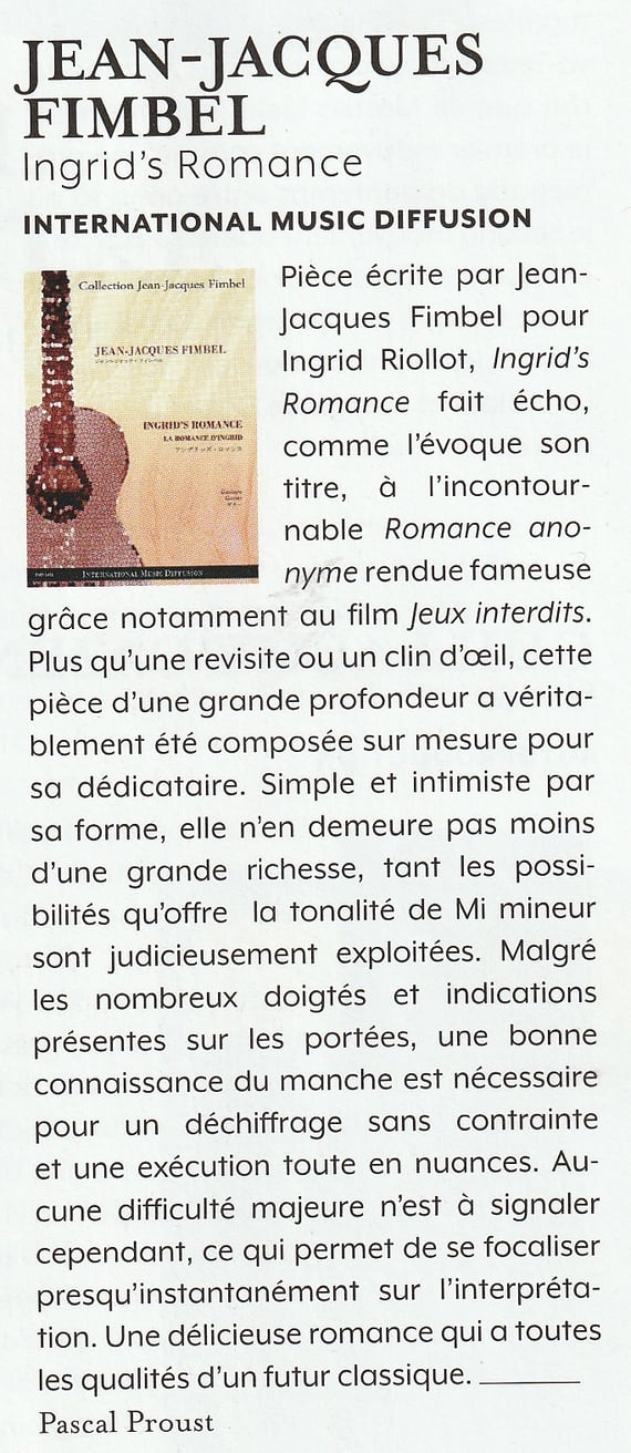 "Après avoir été bercée par la célèbre Romance anonyme “Jeux Interdits”, c’est avec une grande émotion que je vous présente cette merveilleuse composition de mon ami Jean-Jacques Fimbel Ingrid’s Romance, qui n’a décidemment rien à envier à son aïeule. La tonalite de mi mineur révèle des sentiments de passion, délicatesse, expressivité, intensité, romantisme, contraste et émotion. De caractère tonal et de forme ABA, Ingrid’s Romance développe une mélodie aux accents mélancoliques et passionnés. J’ai eu un très grand plaisir à créer cette pièce le 15 mars 2023 à l’auditorium du Caudan Arts Centre, Port-Louis, Ile Maurice. Ingrid’s Romance a été accueillie avec un très grand succès par le public mauricien."