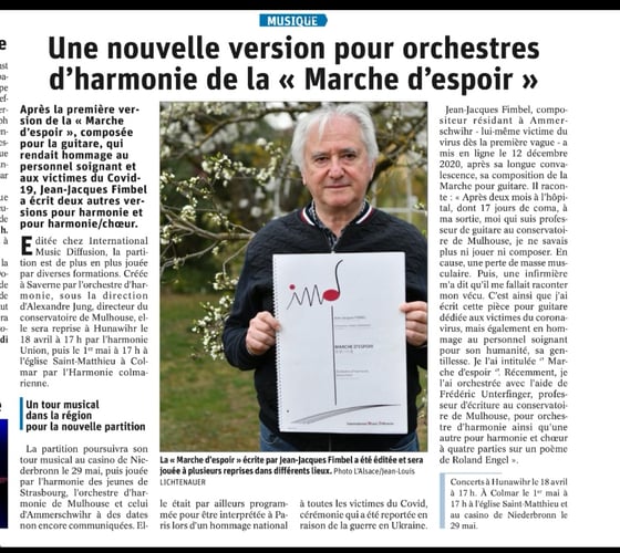 La partition de "La marche d'espoir" dédiée aux victimes de la Covid19 et au personnel soignant est disponible chez IMD. Interview dans les Dernières Nouvelles d'Alsace. Interview France 3 Alsace